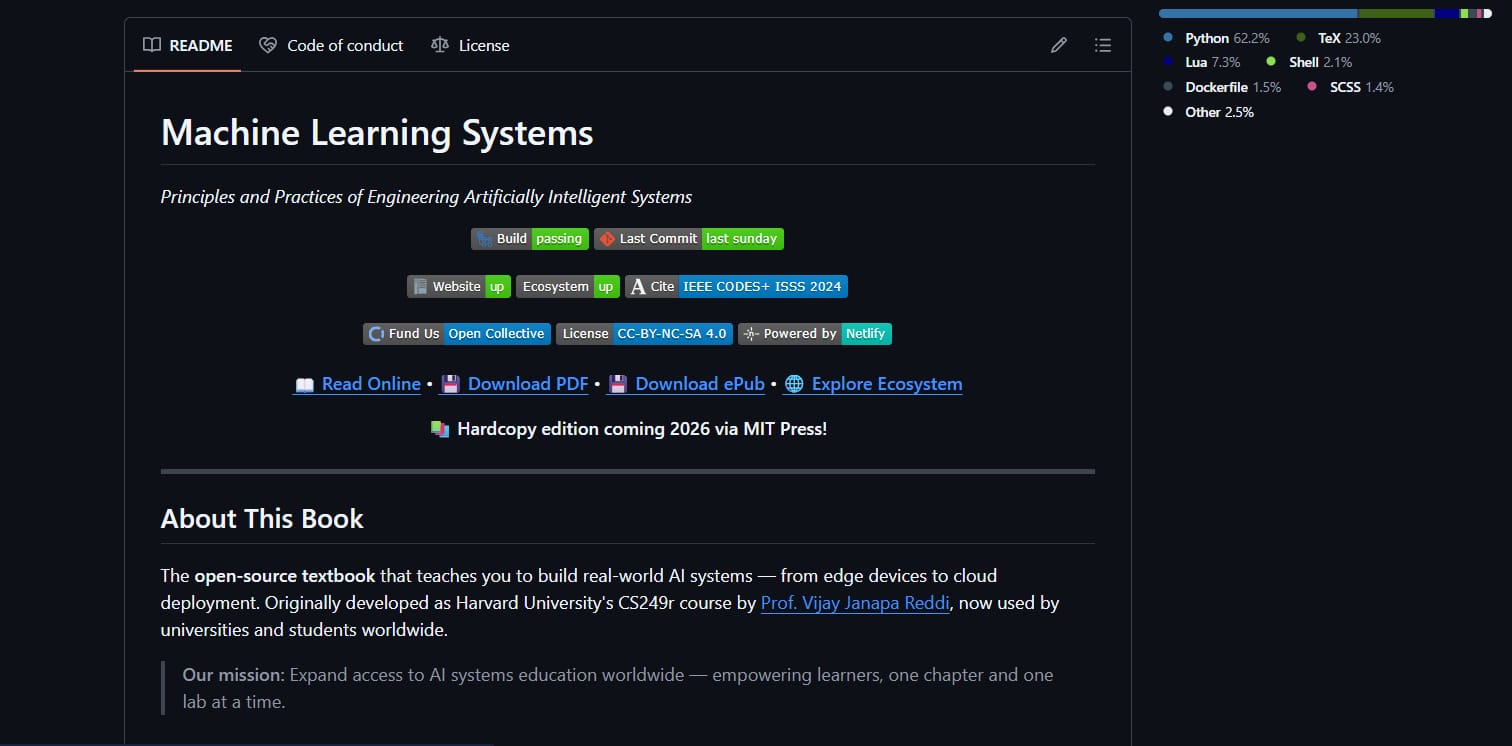 [ يقدم هذا الريبو – المعتمد على مقرر (CS249r) من هارفارد – الدليل التعليمي مفتوح المصدر بالكامل، والمختبرات العملية مع كود TinyTorch المخصص للتعلم.]