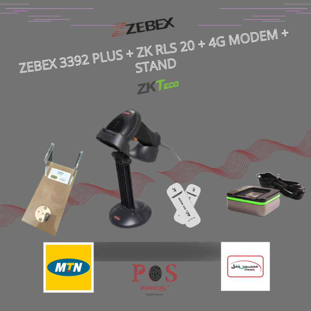 بكيج لبيع خطوط الموبايل لشركتي سيرتل و MTN يتكون من جهاز قارئ باركود وجهاز بصمة بالاضافة الى مودم 4 جي عدد 2